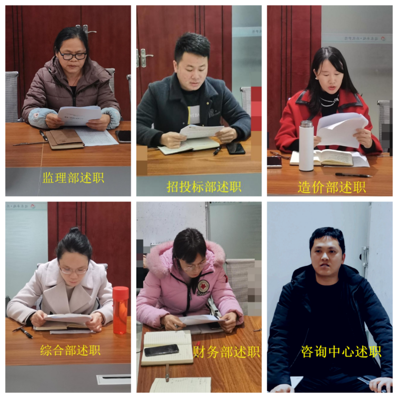 由监理部、招投标部、造价部、综合部、财务部、咨询中心各代表先后作详细的年终述职,每一个部门代表在述职报告中完整的总结了2021年度的工作,包括已取得的工作成果、不足、存在的问题、解决的办法以及对公司的建议,并展望2022年,对本部门工作提出了目标、实现途径等。